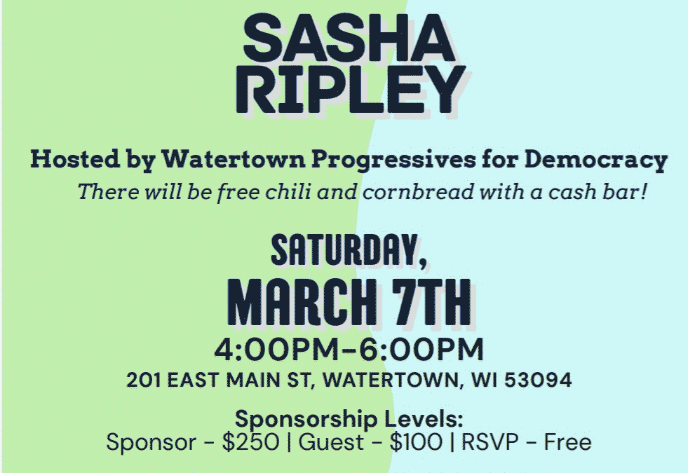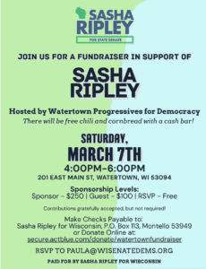 • Sunday, April 19  – Collect nomination signatures for Sasha Ripley, Mike Van Someren and Terri Wenkman – 1 pm, 109 N 3rd. Watertown